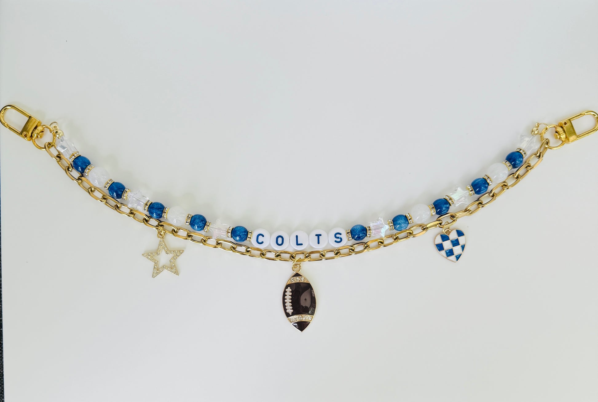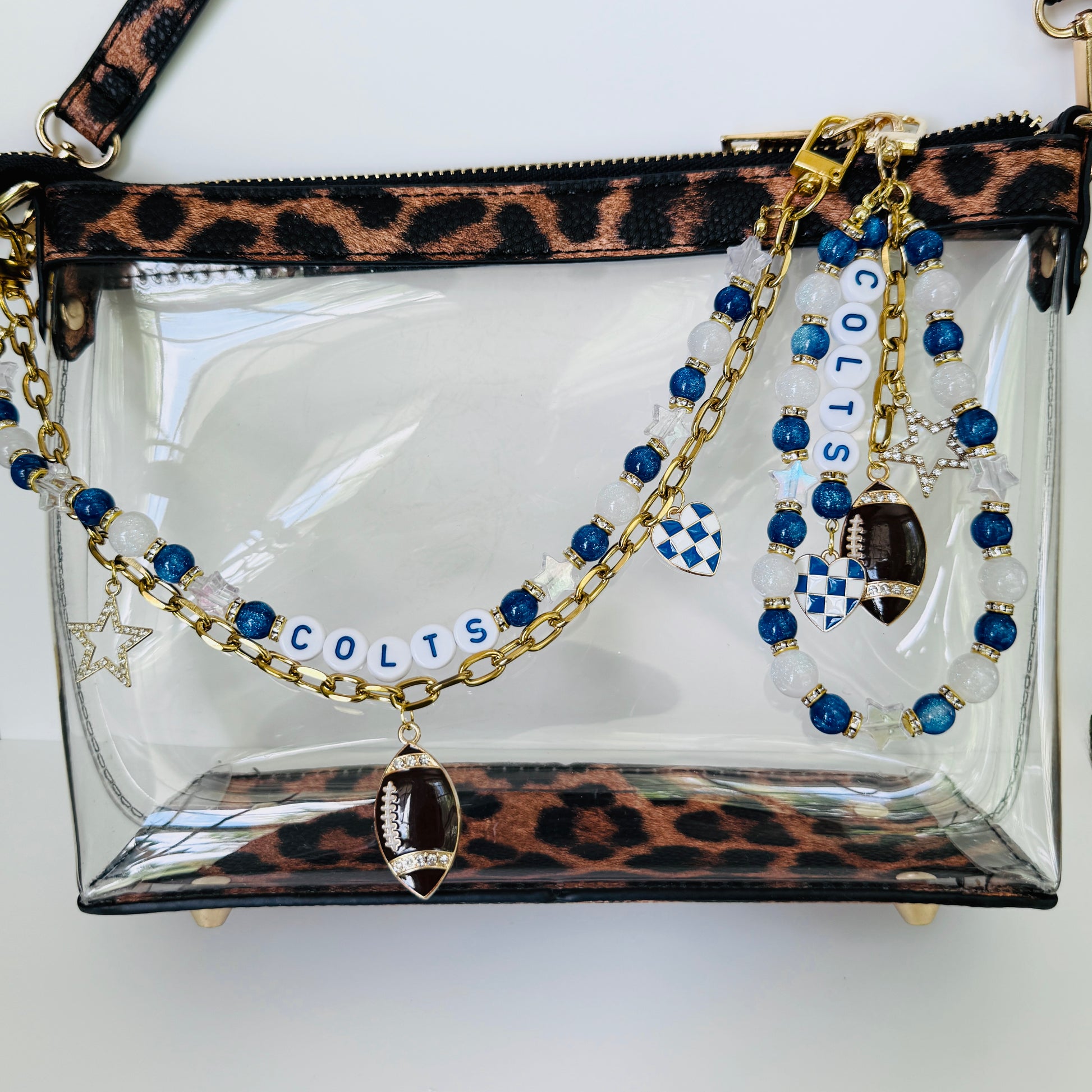 Show up in style on game day with this handmade Colts-inspired bag charm or purse chain! Featuring bold blue and white beads, sparkly accents, and fun football-themed charms, this piece adds the perfect touch of flair to any clear stadium bag or tote.