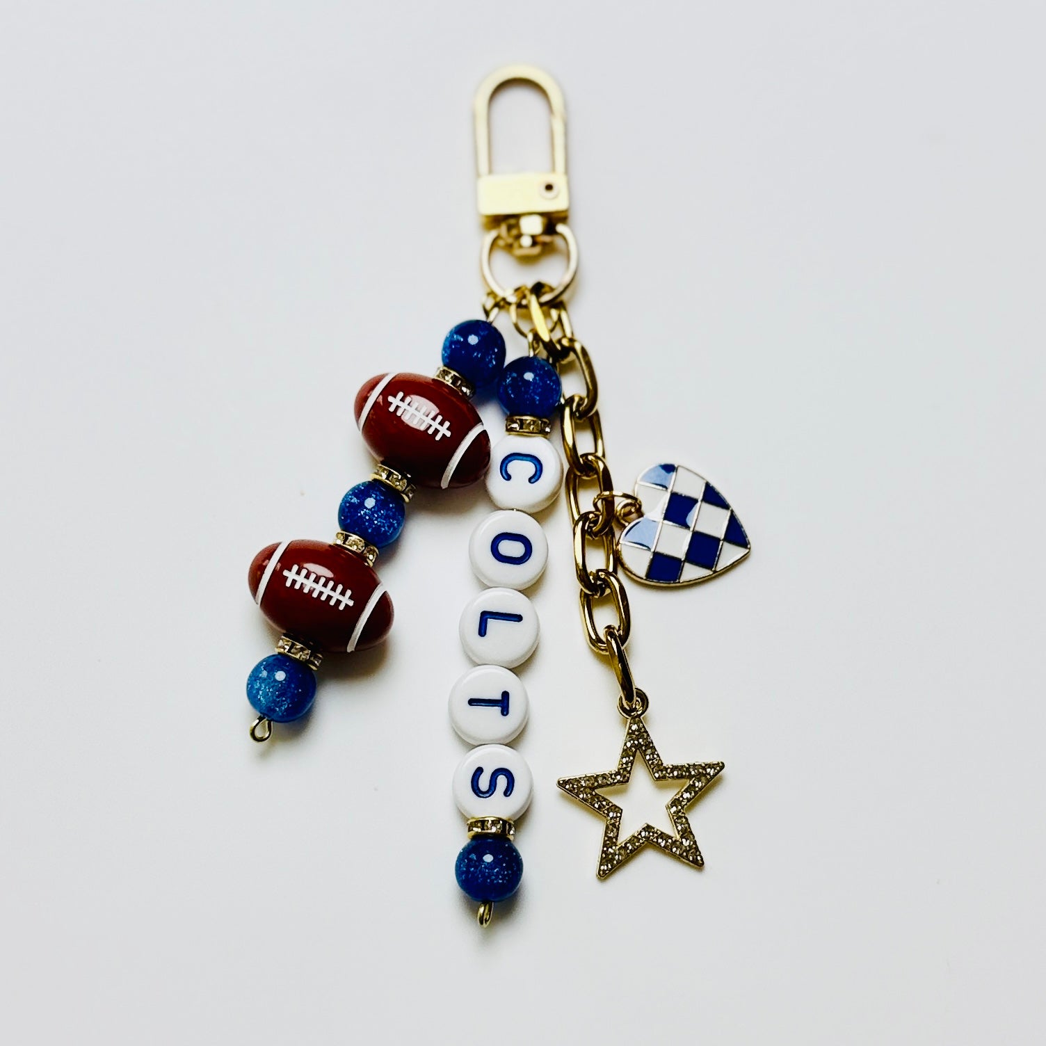 Colts Football Beaded Keychain: Gold Bag Charm with Enamel Heart and Star