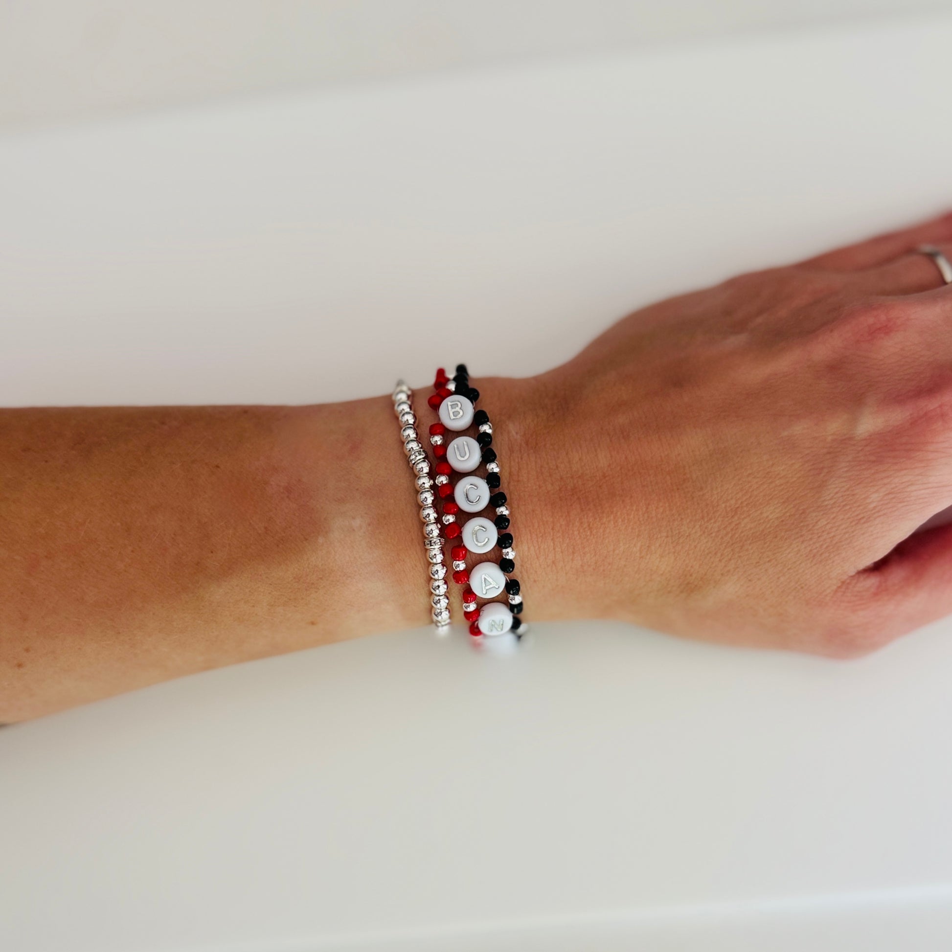 Set sail with Buccaneers pride! This handcrafted stretch bracelet features bold red, black, and silver glass beads with crisp white letter beads spelling BUCCANEERS—the perfect piece for fans who want to rep their team with style.