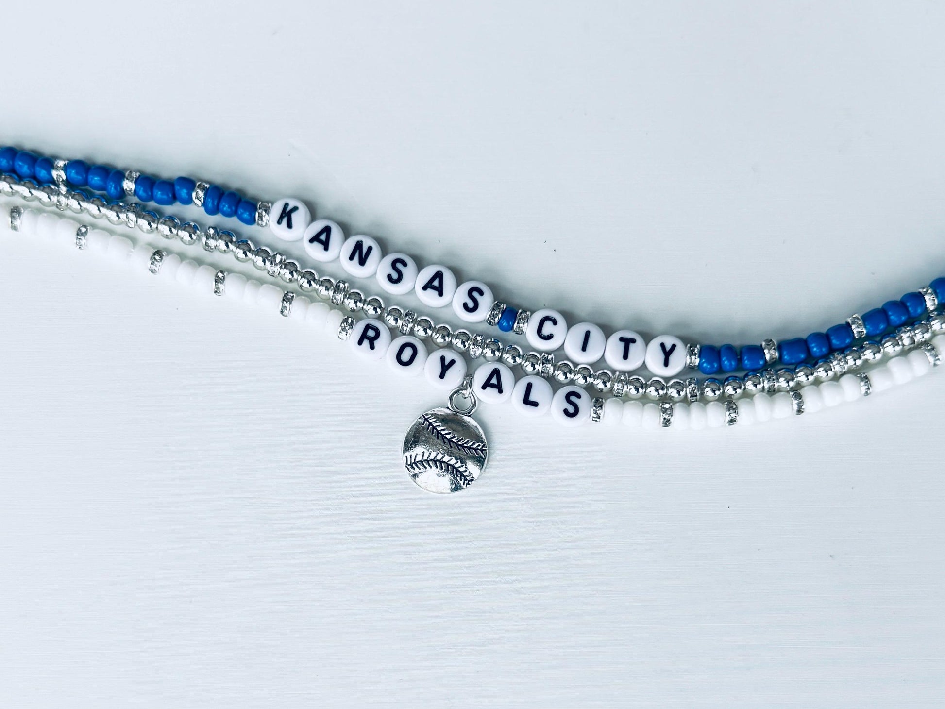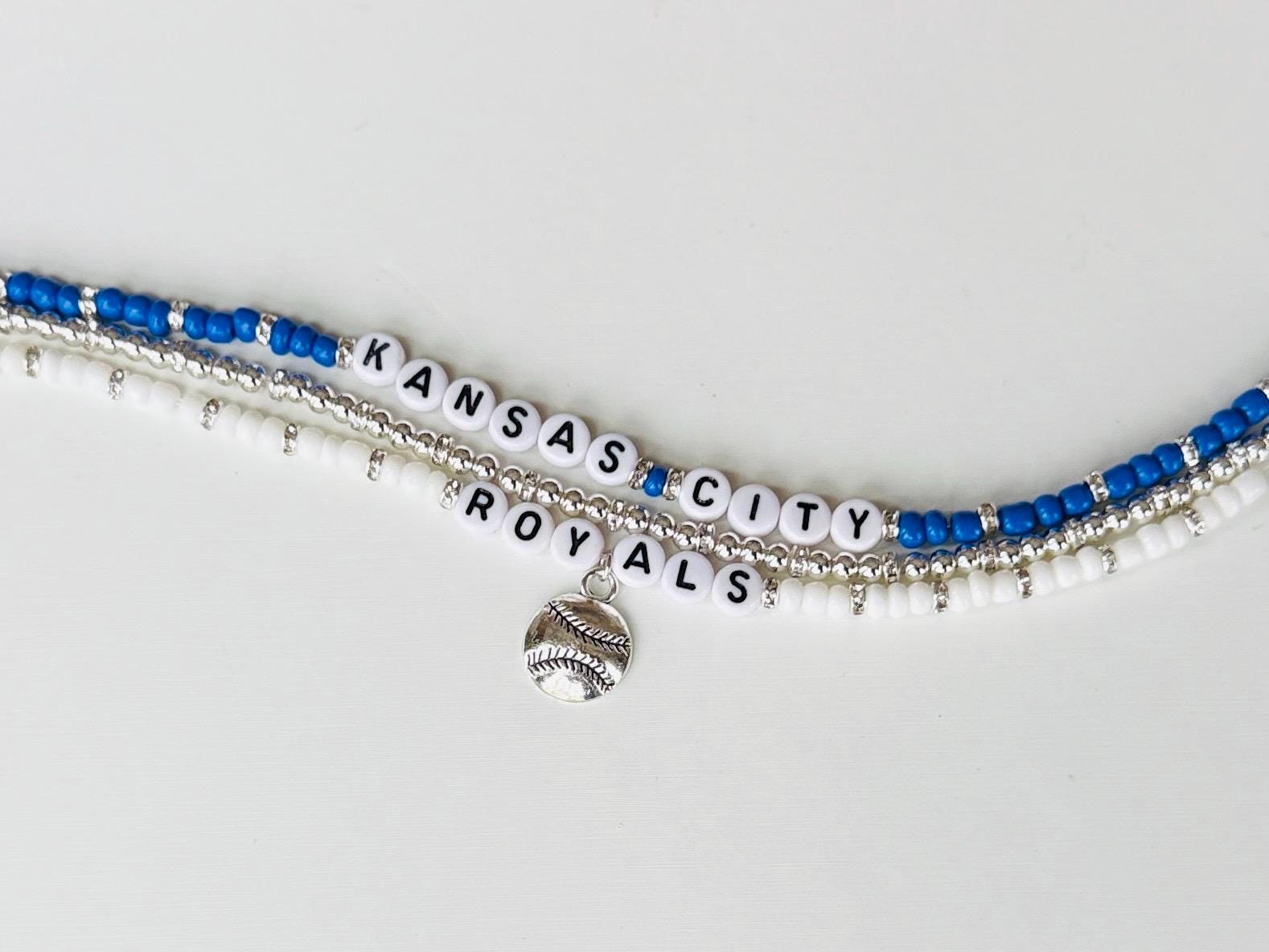 This Kansas City-inspired 3-bracelet stack brings game day energy in a sleek silver, blue, and white palette. Handmade and stretchy for easy wear, each bracelet can be worn solo or stacked together for maximum impact. A perfect gift for baseball fans, spring training travelers, or anyone who wants to show their KC pride in style.