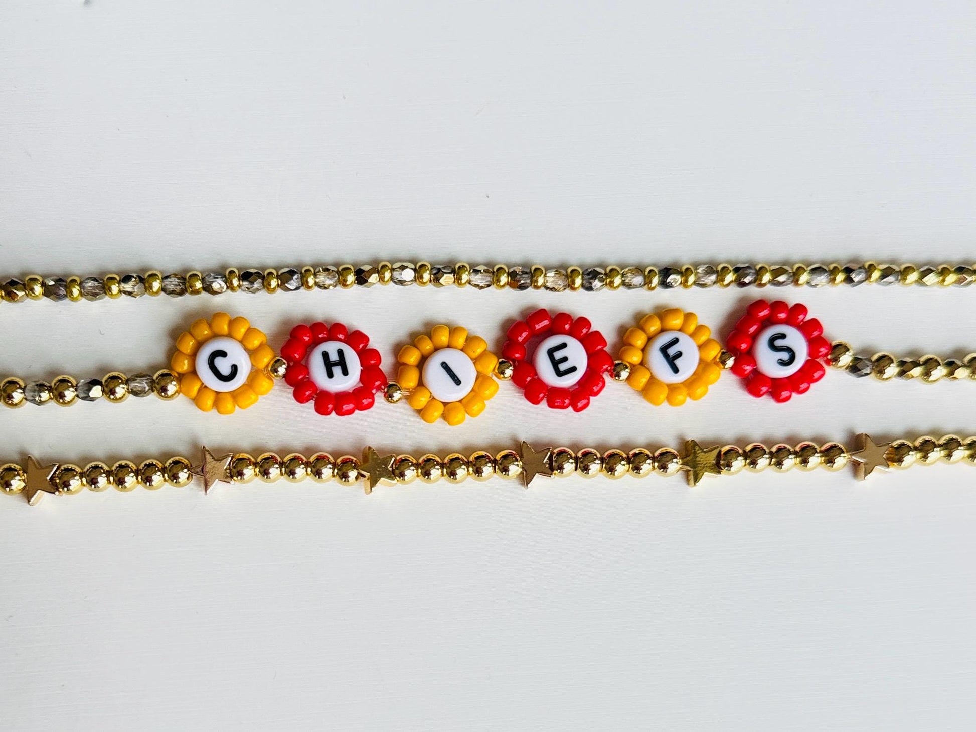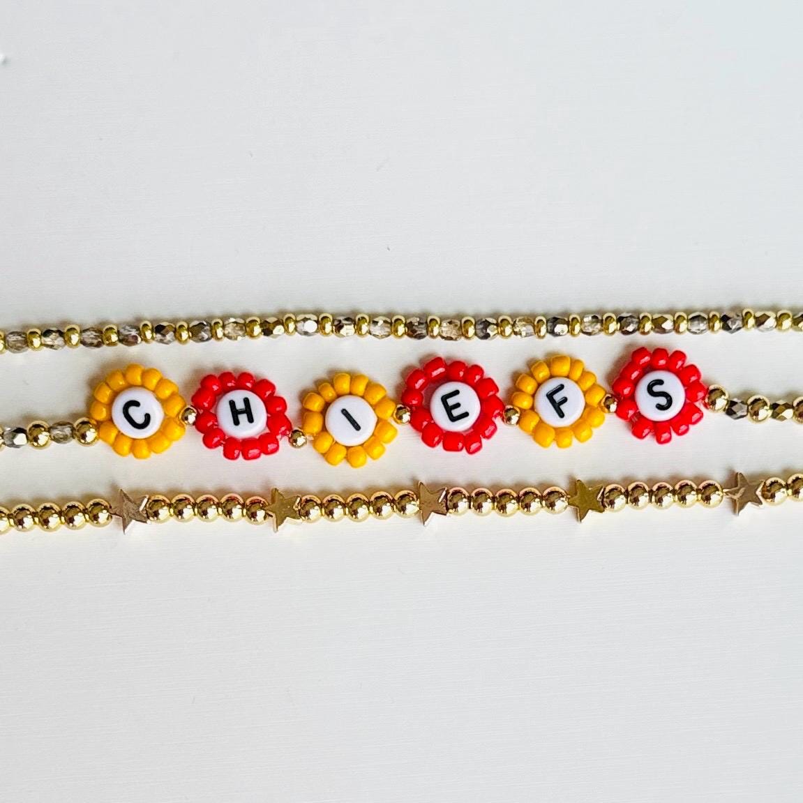 Perfect for football fans, sports moms, or anyone repping KC colors with flair, this bracelet stack makes a thoughtful gift or personal game day staple.