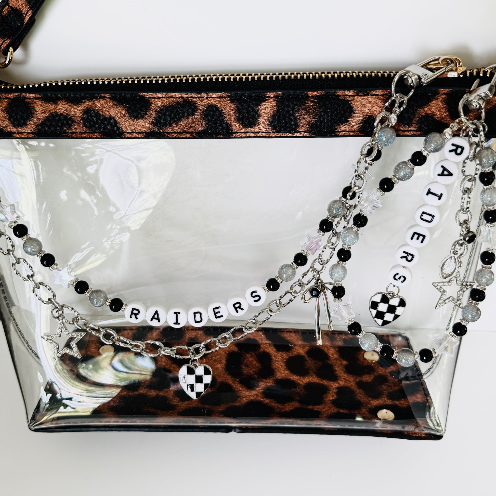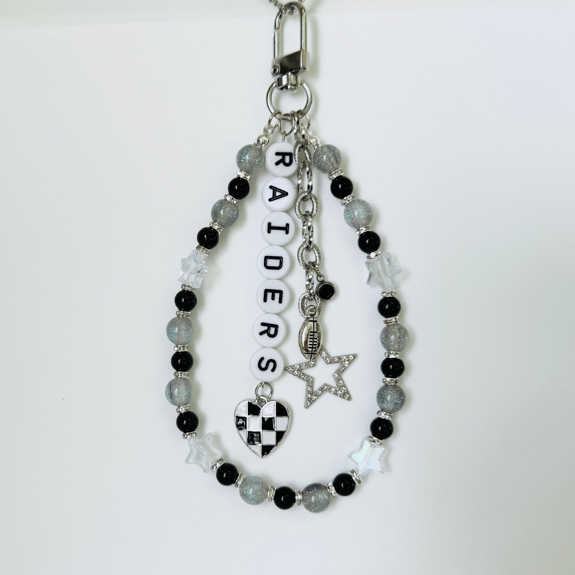 Bring the edge and intensity of the Raiders with this handmade black and silver bag charm or purse chain. Featuring bold beads, star power, and sporty accents, this is the perfect way to level up your game day look.