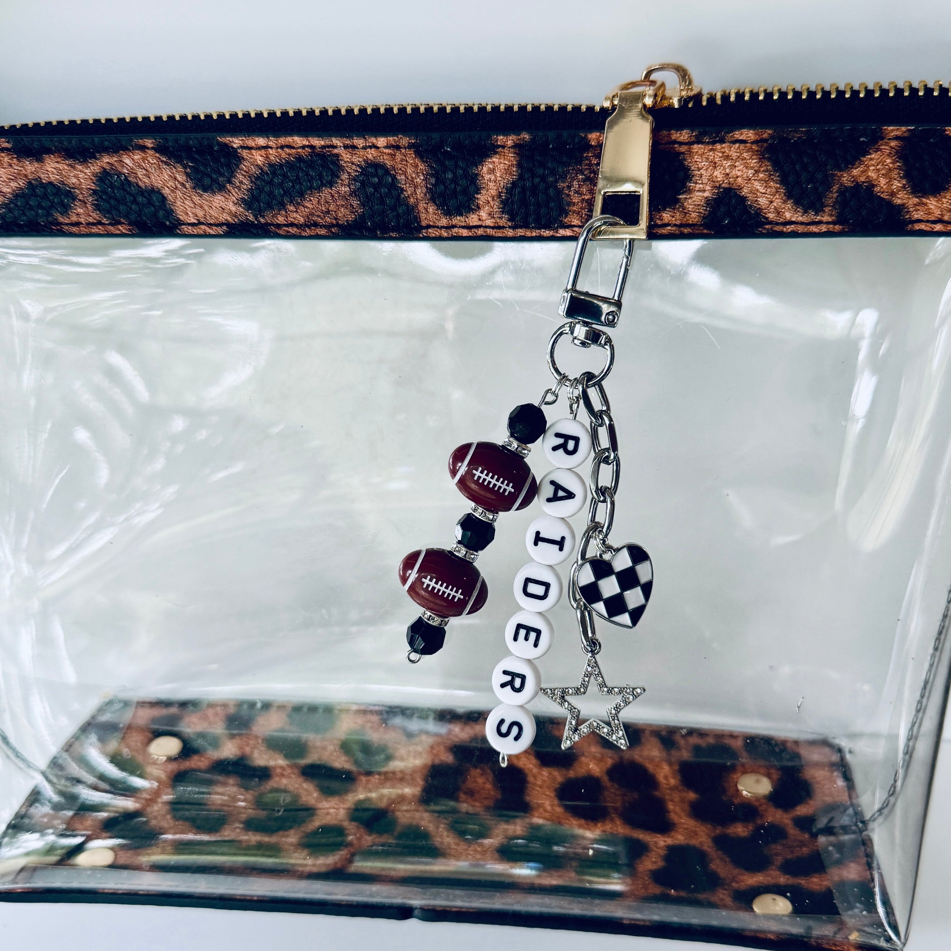 Raiders Football Beaded Keychain: Silver Bag Charm with Enamel Heart and Star