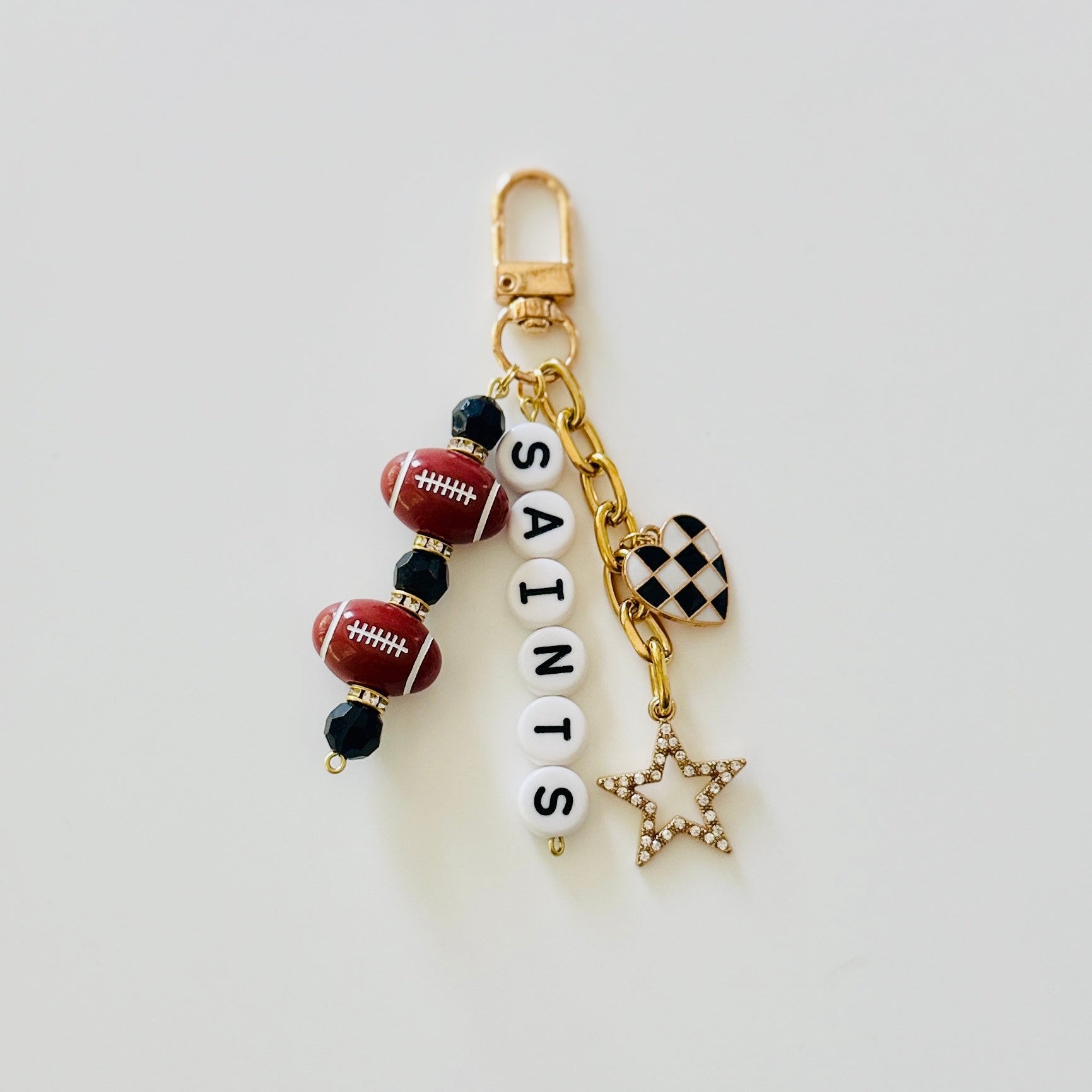 Saints Football Beaded Keychain: Gold Bag Charm with Enamel Heart and Star