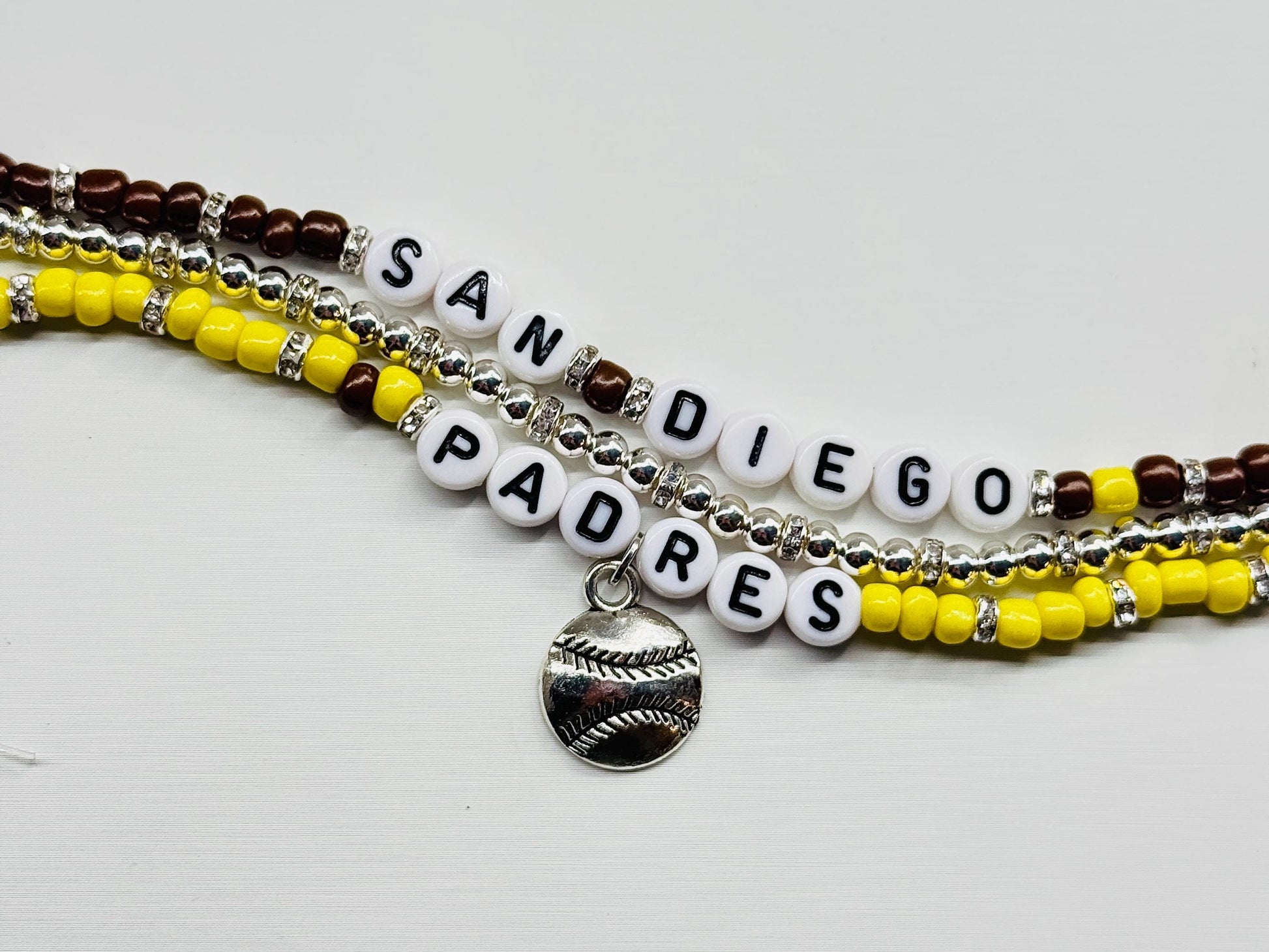 3 bracelet stack - brown, yellow, silver plated with baseball charm